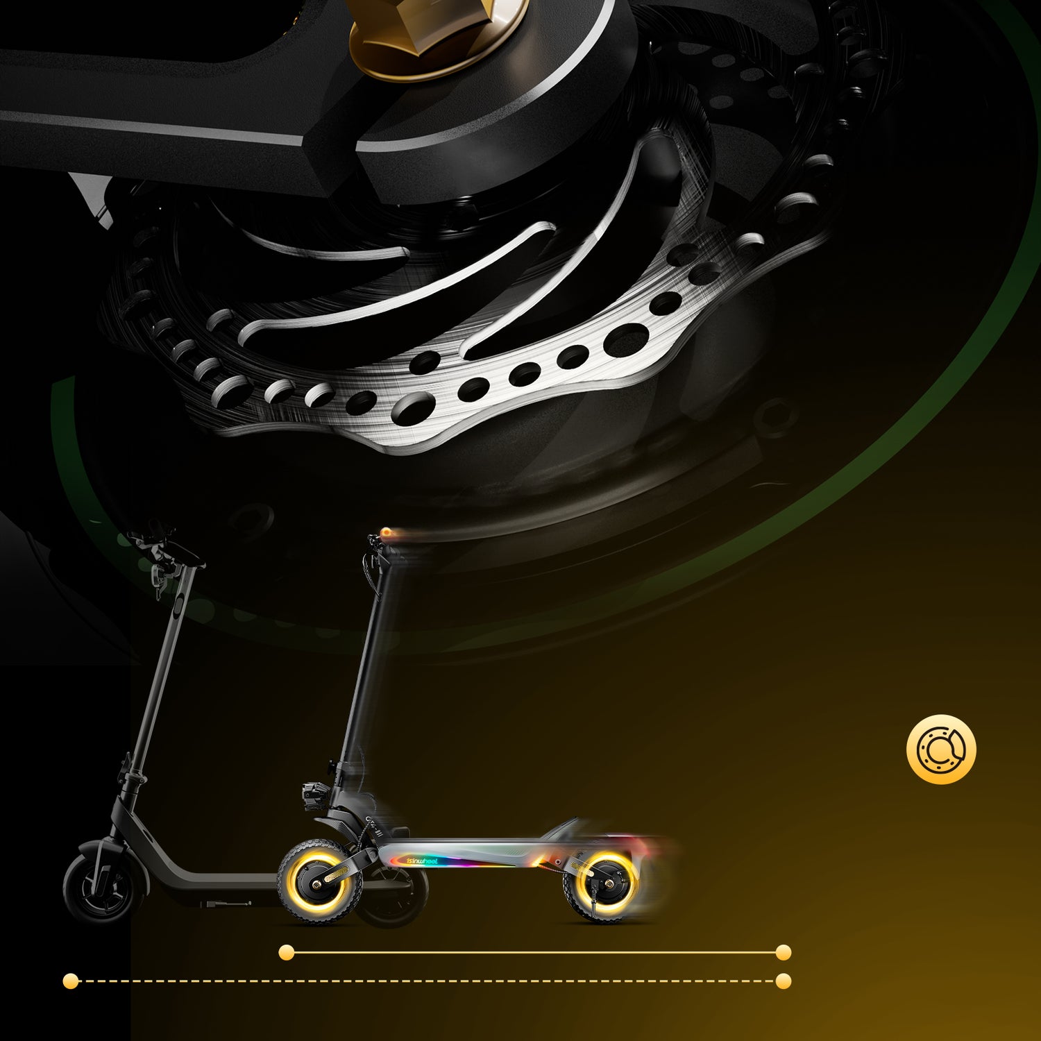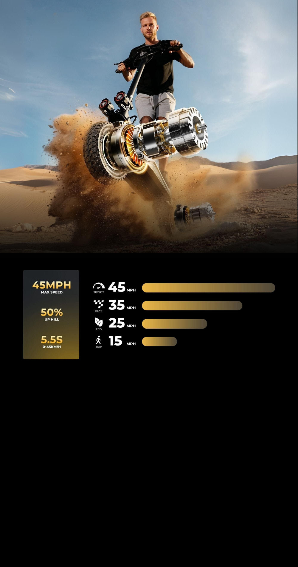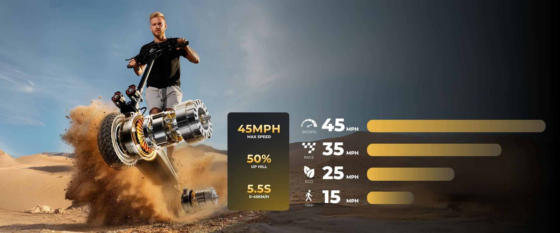 The GT4 features dual independent motors with a combined peak power of 2400W, offering smooth, balanced acceleration. With 8 selectable riding modes, a top speed of 45 mph, and 50% climbing capability, every ride feels effortlessly powerful.