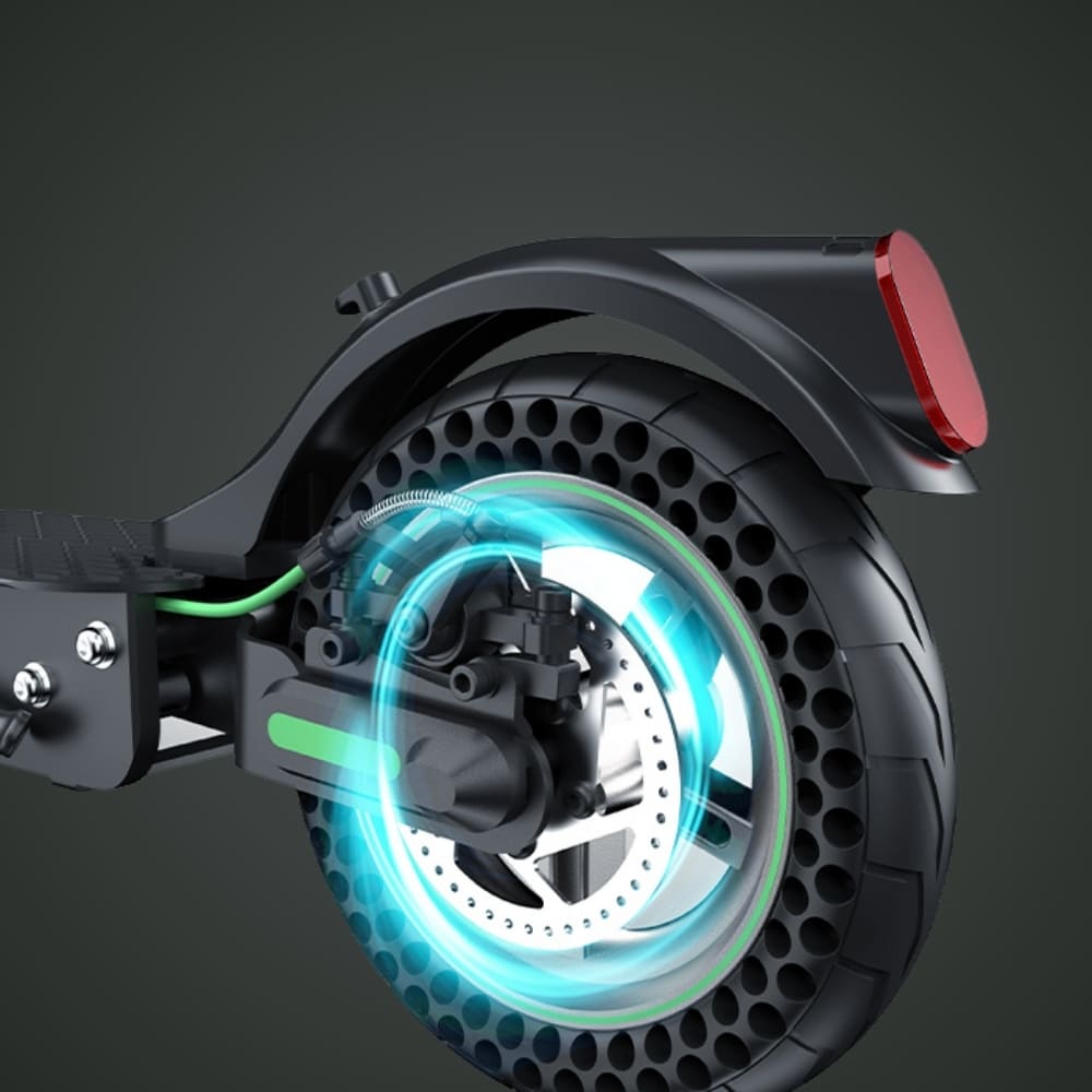 The S9MAX electric scooter features 10-inch solid tires to prevent punctures; a 500W motor provides rapid acceleration and continuous power, enhancing durability and hill-climbing ease.